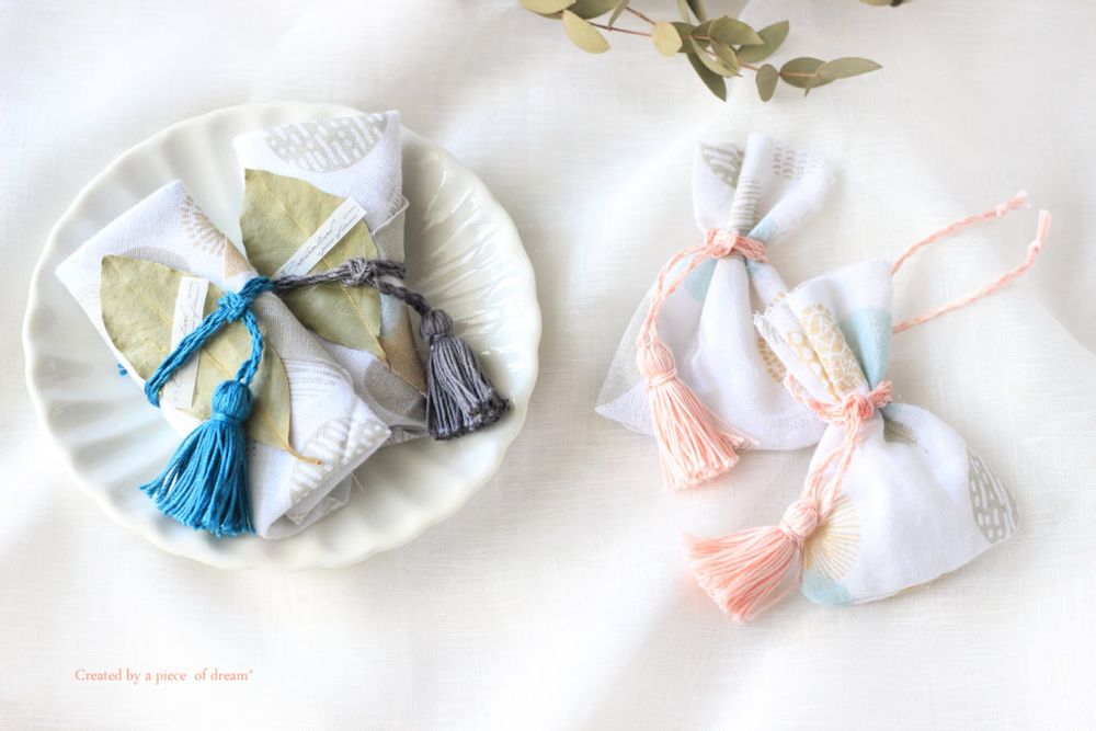 こちらは香りを含ませたコットンをお茶袋にいれ、布に巻いただけ! 巾着型に縫ったサシェです。簡単ですが、リボンや麻紐・タッセルなど、結ぶものを工夫するとオリジナル感がアップします。