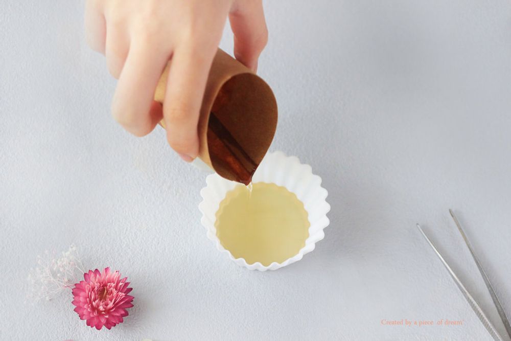 キャンドルが溶けたらシリコンカップにそそいでいきます。そそぐときは紙コップの先をつぶしておくと作業しやすいです。やけどに注意しながら作業しましょう。
