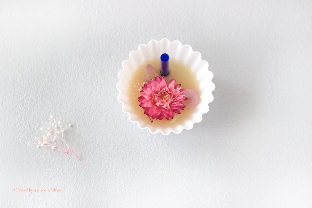 表面に膜が張ってロウが固まりはじめたら、垂直にドライフラワーを挿すようにのせます。タイミングが早いとドライフラワーが沈み、遅いとロウにドライフラワーが接着できないのでタイミングを見て作業してください。