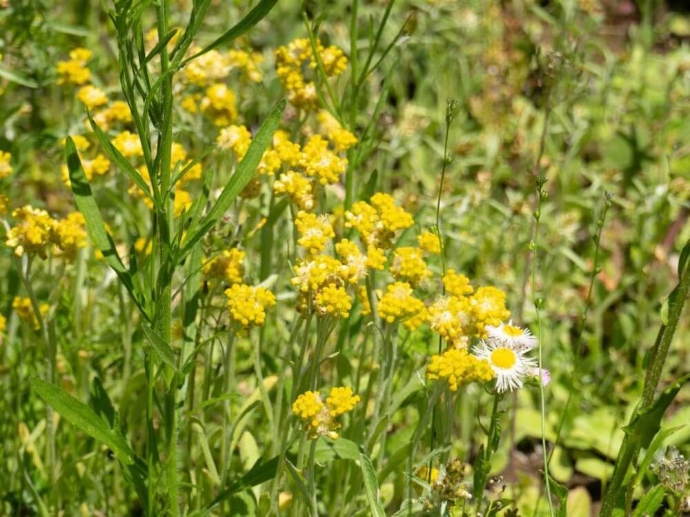 ハハコグサ(母子草)は草丈20~30cmほどですっと伸びた茎の先に、黄色いつぶが集まったような花を咲かせる野草です。