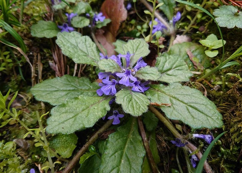 ジュウニキランソウは、ジュウニヒトエとキランソウの種間雑種です。3月~5月に咲く花は淡い青色から白色で、ジュウニヒトエに似ているものとキランソウに似ているものと個体差が見られます。