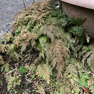 品種不明の斑入りイワヒバ ようやくイイ感じの鉢があったから植え替え🪴 けっこう根さわったから枯れへんかったらええんやけどなぁ〜🌿