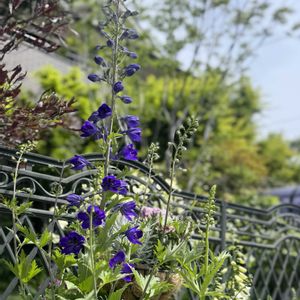 〜今日の庭〜 表(おもて)の花壇から ❷ ①②③ *デルフィニウム ブラックナイト* 《New Face》🏷️ 昨年末に 小苗を植え…咲き出した!! 綺麗なブルー💙💜🖤 花帆が たくさん ラベルの写真みたいに咲いて欲しいな! ④ *宿根サルビア ブルーノート* 今年も健在 元気良すぎて ビオラ 押されてます😆 手前の*ディコンドラ*も綺麗に出て来た💚 ⑤ 他にもモリモリ 根元でガツンとカット✂︎した *サルビア レウカンサ(アメジストセージ)* *ネペタ ウォーカーズロウ* 真ん中のは…*ニゲラ*