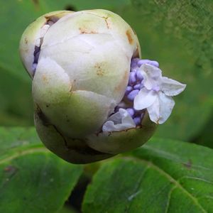 タマアジサイの可愛い咲き始めを集めました、今の時期は高尾山のあちらこちらにタマアジサイの花とハグロソウの花が沢山〜咲いて綺麗です💜🌿 5️⃣ 珍しい白いタマアジサイの花です、2株白花が並んで咲いていました。 タマアジサイの花は日本固有種です。 苞葉に包まれた丸い玉のような蕾から、苞が剥がれ落ちて中から淡紫色の花が伸びて咲きます。 アジサイ科アジサイ属
