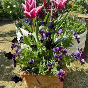 こんにちは😃 穏やかで良いお天気です☀️ 一昨日からクシャミが止まらなくて鼻水🤧も酷い😢 前の日に花粉症の薬を飲み忘れたせいだと思いましたが昨日も今日も続いています。 熱は無いけどダルさはあって、これは数年ぶりに風邪を引いたんだわきっと🤧🤧 やっと少し動く気になったので今年のチューリップ🌷の寄せ植えの写真撮りました。 ①ギャラクシーとミステリアスバニーとプラチーナ(後ろになってて見えない😅)➕チューリップ・クラウディア🌷 これはパンビオの苗を植える時に隠し球で同時に植え込みました🌱 ちゃんと咲き揃って大成功だな🥰 ②絵になるスミレ・パルムとビオラ・アイクールとキングフィッシャーデージーとエレモフィラ➕チューリップ・レディジェーン🌷 チューリップが咲き始めて良い感じになりました🥰 チューリップだけ別鉢に植えてあるのを入れてあるので花が終わったら何かと入れ替える予定です😃 ③アンドロサセ・スターダスト➕チューリップ・ドリーマー🌷 これはチューリップの球根を植えてから間に種まきっ子のチビ苗を植えました🪴 こういうのも面白いと思う🥰