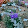 エレモフィラの花期は1月から6月で、花の色は薄紫、ピンク、黄色、白ですが、多くは薄紫をしています。オーストラリア原産の植物で、寄せ植えの名脇役といってもよいでしょう。シルバーリーフとして親しまれる植物で、茎や葉はグレーがかった緑色です。