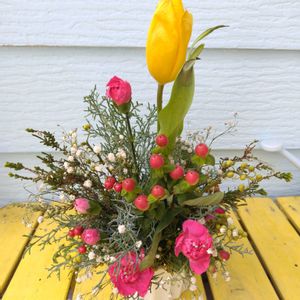 今までの切り花やアレンジを解体・合体させて、小さなアレンジにしました💐 あり合わせ?…なので、同じ色ばかりになってしまいました😅💗💞💕