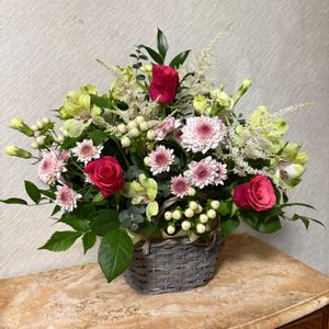 ローズ色のバラでアレンジメント バラにローズ色ってゆうのもなんか変? 一番のお気に入りは白いアスチルベ 在り来りのアレンジに動きが出て ちょっと良くなってませんか?