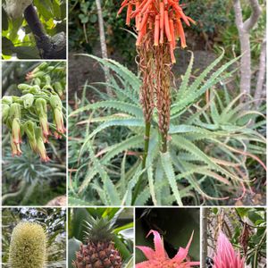 寒くなりました〜 風が冷たぁーい🌬️ 植物園の温室が恋しい… 先週の土曜日に出かけた植物園の温室には元気な植物がいっぱい! キダチアロエ(ワスレナグサ科)のお花が綺麗なオレンジ色で咲いていました〜(上段右側) 2枚めは、ヤマモガシ科の2種 バンクシアとプロティア 上段がバンクシア 下段がプロティア 3枚めは、キダチアロエ 4枚めと5枚めは、アツバキミガヨラン(クサスギカズラ科) 温室の外で大きな株を作っています。お花は大分咲き進んでいますが、まだ蕾も残っている様子が見えます。