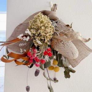 ドライの花たちですが、風に吹かれているイメージで作りました🍀 2つ目は、千日紅を集めた小さなスワッグです💐