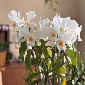 先月蕾でアップしたデンドロビウム月のしずく 大寒の日に1輪咲いて その後次々開花🤍 去年は3月に咲き始めたので今年はずいぶん早くて嬉しい✨ ①~④ スライドしてご覧ください