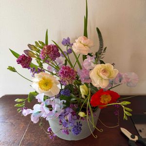 フラワーアレンジメント教室で作って来ました。 生花のアレンジ 生け方が今までやってた方法とは違って、茎がクロスして生けています。 春の花は可愛いなぁ😍 ハーデンベルギアは、先生のお庭に咲いていた花を好きな所を刈り取ってきました。楽しかったです。😄