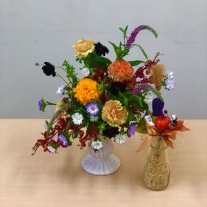 2025.10 フラワーサークル🍀にて𓂃𓂂ꕤ* ・ ハロウィン🎃飾り&オータムアレンジ🤗 ・ クッキー🐶のお供え花🌸