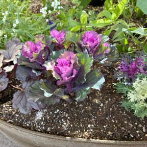 やっと冬花壇に衣替え〜😍 葉牡丹(右)はスプレー咲きロマンツリー。新製品らしい😳
