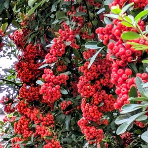 花散歩で✨ 🔴💚🩷🤍🐉🌿🟡🌹♪ 1️⃣ピラカンサ 2️⃣ルクリア 3️⃣リュウノヒゲ白竜 4️⃣細葉柊南天 5️⃣鮮やかな 薔薇♥️ 今日も 笑顔😄で 過ごせますように💐 今週も宜しくお願い致します🙇