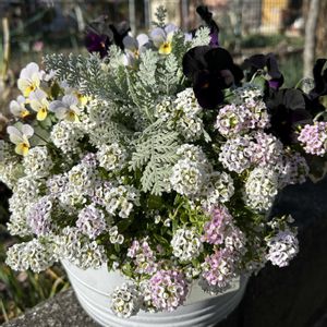 おはようございます♡ お迎え2ヶ月の寄せ植え♡ アリッサムの寄せ植えみたいだけど😅 小輪ビオラ ビオレッタ ラバーズ 黄色💛パープル💜色変😆 ブラックビオラ🖤 モリモリです🥰 おまけに 3つのリーフ🍀健在です☺️ 今日はお休み〜🥰 厄除けお詣りして来ます⛩👏😑 雪降りそ💦😅