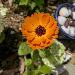 冬越しのキンセンカ 3株中一株だけ残りました🧡 秋明菊の若葉 🌿こぼれ種のコキア 💚ヘデラ 💛八重咲き山吹