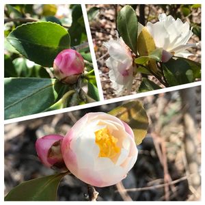 おはようございます ①毎年楽しみな白い寒椿のお花 ②低木の寒椿 紅白のお花❤️🤍 ③山茶花を見上げて 今年もありがとう🥰