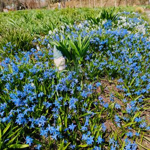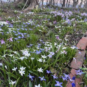 春の妖精スプリングエフェメラル チオノドクサの🩵青は庭のあちこち一面をブルーにしてます🩵🩵🩵 プシュキニアも頑張ってますがチオノドクサの迫力には負けてます。 この小さな花たちを綺麗に写したいと思うけど、これも腰に良くないね。 やはり今年も庭仕事はできませんね😔