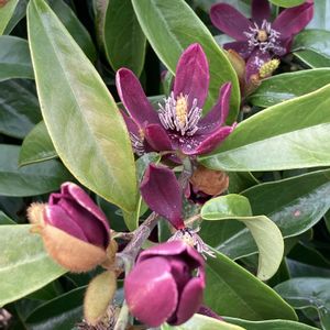 カラタネオガタマの紅バージョンみたいなコに会いました! 4〜5cmの小さな花と蕾がギッシリでした🥳 このコは誰ですか ご存知の方は教えて下さいませ ちなみに香りは特に…😅 こむこむさんに、オガタマノキ パープルクィーンでは?とご教示いただきました😄 皆様の投稿picとも合致しますので、🏷️付けさせていただきます🙆♀️ (先日アップしたカラタネオガタマはあれから嗅ぎにいきました ちゃんとバナナの香りがしました🍌 美味しいバナナ加工品の飲食物の匂いでした🍌🎶) 2025 5/19 撮影