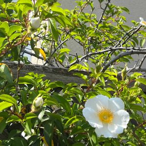 ナニワイバラ バラ科バラ属 常緑つる性木本 中国原産とする原種のバラの1つ 果実はローズヒップと呼ばれ、ハーブティーに使う。 日本に渡来したのは1704〜1711年で、浪速商人が渡来を担ったため、ナニワイバラと名づけられた。 古くから観賞用として栽培されるが、紀伊半島南部、四国、九州の山地では野生のものもある。 花期4〜6月 直径5〜9cmの白、または紅色を帯びた白色の一重咲きで、多数の雄しべがある。 果実は偽果で、表面は長い毛でおおわれた独創的な形である。 長さは3〜4cmで10月頃に黄色あるいはオレンジ色に熟す。 🏷️あっ火曜日 に参加させていただきます。