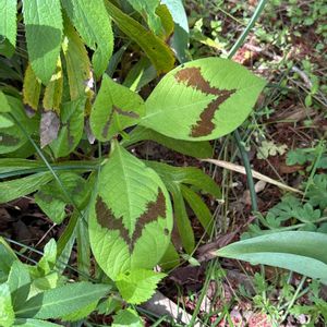 今日の庭から フレンチラベンダーと斑入りの葉っぱ達 1)フレンチラベンダーのウィローベルが目覚めましたよ~🙆 2)フウチソウの葉 3)白花ホトトギスの葉 4)ミズヒキソウの葉 5)アマドコロの葉