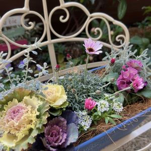 🍃ꕤ寄せ植えꕤ🍃 葉牡丹は大きさも色も違う3種類の組み合わせ、寄せ植えに入れると華やかです🎵 中央には淡いピンク色のローダンセマム、右側に濃いめのフリルパンジーを合わせました。 こちらは実家用なので、寄せ植え直後の写真です🤳 今はもう少し花数か増えているみたいです💕 🌸パンジー ドレープ・シエナ 🌸ローダンセマム リルピンク 🍂葉牡丹 萌花コレクション 🍃サントリーナ 雪のサンゴ礁 🌿オレアリア リトルスモーキー