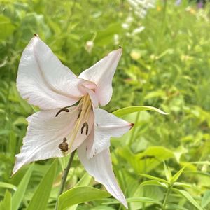 【ササユリ(笹百合 )】 日本原産、ユリ科多年草 日本固有種のユリで、中部地方から九州にかけて分布する。山地の草原や明るい森林に自生し、初夏に白または淡いピンクの清楚な 花を咲かせる。 葉が笹に似ていることからササユリ(笹百合)の名がついた。 ロート状の花は長さが10~15cm、横向きに花をつける。雄しべの先につく赤い葯が印象的で、甘い香りがする。 繁殖力が弱く、群生しにくいこと、成長が遅く、開花するまでに 7~8 年もかかることや近年乱獲によって自生株が減少している。 草丈:50cm~1mほど 開花時期:6月~7月 花色:淡いピンク、白 鹿野天神山公園@周南市