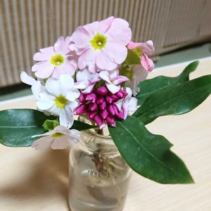 ベランダで咲き始めた沈丁花✨大好きな香り✨赤が一足先に咲きました、白ももうそろそろ咲きそうです✨ 大好きな香りを部屋にも届けたくて。一枝。折れてしまったプリムラオブコニカを挿していた瓶に添えました。 部屋中に大好きな香りが漂って本当に幸せです✨ 春到来ですね✨
