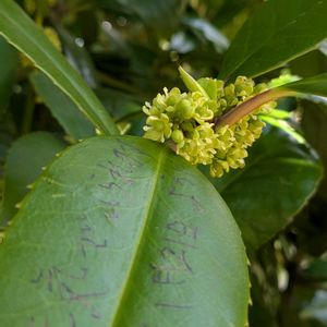 🏷️木曜日は木 その2 ✩ タラヨウ (相模原公園にて 4月20日) 雌雄異株です。 雌雄2本が並んでました。 ①② 雌株、雌花 タラヨウの別名は ハガキの木。 葉の裏側🌿を、先の尖ったもので傷つけると、黒くなるらしい。 でも これは 葉の表側🌿に、ボールペン(?)で書いてある? ハガキというより、七夕の短冊か? ③ 雄株、雄花 ④↙️タラヨウ雄株の下に、珍しい植物を見つけました😮 葉っぱを突き抜けたような形で、下向きに花が咲いてます。 ⬆️ヤブガラシにも、 ↘️スギナにも、 同じ花が咲いてる😮→🤔 タラヨウの雄花が上から落ちてきたものらしい! と気づきました。 あまりにも キッチリとハマり過ぎてる! ⑤⬆️落ちていた雄花 ⬇️落ちていた雌花 両方とも真ん中に穴が空いてる。 雄花のほうは、反り返ってる。