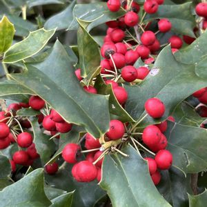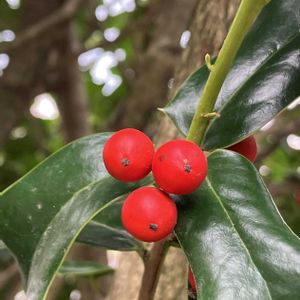 散歩道のセイヨウヒイラギの赤い実です。別名クリスマスホーリーとも呼ばれているそうです。 古希近い私ですが、クリスマスは幼い頃から嬉しい日でした。毎年、子供会でクリスマス会を開いてくれました。保護者の皆さんの作ってくれた夕食を皆でいただきながら、歌を歌ったり踊ったり、クイズを出したり、楽しい時を過ごし、最後に全員で「きよしこの夜」を歌って、お土産にバタークリームの小さなケーキの入った箱をもらい、星空の下、帰途につくのでした。 そのケーキに、このセイヨウヒイラギの葉っぱを模したお菓子と赤いゼリーが飾られていました。お菓子の少なかったあの頃、バタークリームのケーキは、夢があって、とても甘くて美味しかったです。 クリスマスの幸せな思い出の一つです💓