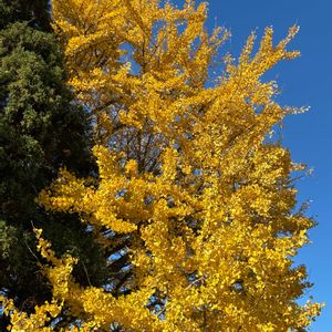 イチョウ (銀杏) 大木の枝が垂れ下がって黄色い葉がカーテンのよう 甘い匂いが漂って、ついついカツラの木も探してしまいます。 黄色い葉より枯れて茶色くなった枯れ葉の方が良く匂うようです🍂