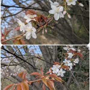 こんにちは🐰☔️ 今日は、ヤマザクラと庭の侘助椿 ①②は、ヤマザクラ(山桜)が咲いててビックリ‼️ ポツポツだけど可愛い💕 後ろ姿も綺麗です🤭 ソメイヨシノはもう少しで🌸 ③④は、侘助(乙女椿) とても小さく目立たないけど、可愛い😍 葉っぱ☘️と比べると、花の小さいのが分かるかしら?🤭 庭に2本の侘助椿が有ります。 3月30日にて