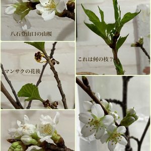 山仲間が八石山で折れていた桜の枝を届けてくれてはや1ヶ月弱 桜が咲きました🙌 もう少しピンクかなと思っていたら殆ど白🤍 この奥ゆかしさが山桜らしくて好きです 桜の開花と一緒にずっと気になっているのが何の木かわからない枝 芽吹いた葉をAIで聞くと 「タラの芽」 「コシアブラ」 「アジサイ」 その時々で答えが違います🤭 ♪この〜木なんの木 気になる気になる〜♬ むかーし、こんなCMありましたね