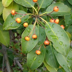 冬青(ソヨゴ) モチノキ科モチノキ属の常緑低木。山地の乾燥した林内や林縁などに生え、庭木にもされる。葉は硬く縁は波打ち、主脈が明るい緑色で目立つ。花期は6~7月。雌雄異株。花は小さな白色で雄花は数個つき、雌花は1個つく。花の数は多くないが良質な蜂蜜が採れるので、蜜源として大切にされる。秋になると雌木は葉腋につややかな赤い果実を1つずつ吊り下げる。果実は核果。球形で長い柄がある。核は三角状楕円形で表面はなめらか。核果に核は4~5個入る。 硬い葉が風に吹かれてそよそよと音を立てる意味の『戦ぐ(そよぐ)』が名の由来。漢字は、冬にも葉が青々と美しいことからの当て字。 出典『樹木の事典600種』『草木の種子と果実』
