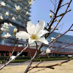 大津港の公園のこぶし。後ろは琵琶湖ホテル。