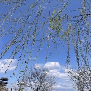 シダレヤナギ 枝垂れ柳 垂柳(すいりゅう)、糸柳 落葉高木 原産地 中国 柳の芽立ちが風になびいています💚 今日は風が強く寒いです💨北の山には雪も見えます❄️ 散歩は直ぐにやめましたよ💦