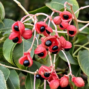 いろんな実❤️💙💚🤎 花が終わって実のなる季節になりました 色も形も様々ですね 1️⃣ゴンズイ(権翠) 関東以西の本州、四国、九州、及び、南西諸島に分布するミツバウツギ科の落葉樹 日当たりの良い低山の雑木林などに自生 検索すると、魚のゴンズイが出てくるので、そちらの方が有名ですね 2️⃣ヤブミョウガ(藪茗荷) まだ花と実が一緒に見られるものも咲いています 3️⃣ホルトノキ(ホルトの木)実と花とオリーブの実 ホルトの木とオリーブの木が隣同士にあって、春にオリーブの小さな花がポツリと数えるほど咲いていました オリーブの木は1本しかなく、両性花で、実も数えるくらいしかありません ホルトノキの実がオリーブの実に似ているので、当時オリーブ油がポルトガル油と呼ばれていた為、ポルトガルの木からホルトノキとなったようです 見た目色も形も似てますね😻 ホルトの方が少し細い感じです 同じ時期に隣同士にあり、両方の実がなっていて、比較しやすいです 4️⃣ネムノキ(合歓木) さやの長さは10cmくらいで長めです 型がついてるように、横長の豆が入っています 5️⃣エンジュ(槐) 丸い玉が何個か連なって、数珠のような形です