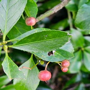 赤い実をつけた樹木 ①②マサキ ニシキギ科ニシキギ属 常緑樹 北海道北部を除き日本中にみられるが 沿岸部に多い 葉はツバキに似ている ②紅色に熟すと4裂し 橙赤色の仮種皮に包まれた種子が見えてくる 果実が赤くそまるまで待ち遠しくて 若い果実を見つけた9月から何度かこの海岸通りに通った 里山のあちこちに自生している ③ソヨゴ モチノキ科モチノキ属 常緑樹 関東地方以西でみられる あちこちでみかけますがいずれも植栽です 葉はクロガネモチに似てますが もっと明るく周辺は波立つ 果実はさくらんぼ🍒のようでかわいい 数が少ないのもいい! だけどしばらくすると赤から黒に熟すらしい 雌雄別株 好きな木! ④エノキ アサ科エノキ属 落葉高木 北海道を除く日本各地にみられる 葉を見慣れると予想以上にあちこちにエノキが生えているのに驚いた! これはエノキの果実は鳥に人気があって糞によって種子を拡散するためだそうだ 赤色だけでなく黄色緑色いろんな色の実がつくが皮に甘味があって美味しいという! これらの木は派手さはないが 少しの赤い実が情を動かす