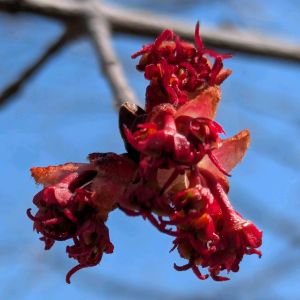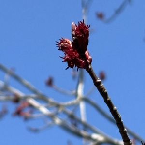 やっと赤い花が見られましたが 雄花だけでした❣️ ハナノキ(花の木) 別名 ハナカエデ *ムクロジ科カエデ属 花期は3-4月 野生のものは長野県南部・岐阜県南部・愛知県北東部の3県県境のおもに木曽川流域の山間湿地に自生し、長野県大町市の居谷里湿原に隔離分布する雌雄異株の落葉高木! 街路樹や公園にも植栽される! ④は秋の紅葉と冬芽.葉痕! この場所に2本植栽されていますから雌雄の木だと思っていましたが、どちらも雄株でした! 🏷️木曜日は木 3月27日撮影