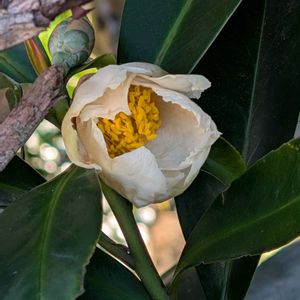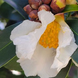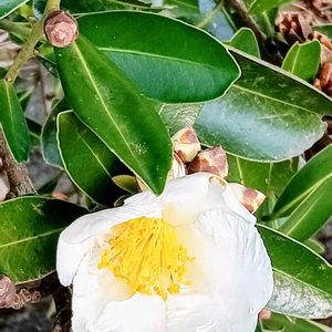 「今日のお花」 ツバキ という事で、昨年11月上旬に撮っていたタイワンツバキをご紹介いたします🥰💕🎶 白くて、大きなお花がツヤツヤの葉っぱに映えて美しかったです✨💚🤍💚🎶 タイワンツバキ ツバキ科 ポリスポラ属 台湾や中国南部を原産とする。 ツバキ科の常緑高木で、樹高は15m程になり、ヤブツバキよりかなり高くなります。 葉は互生し、長さ10~18cm、幅4~6cmほどの長楕円形で、葉柄は長さ1~2cm、表面は濃緑色で光沢があり、上半部に僅かな鋸歯があります。 花は葉腋に単生し、径7~8cmの真っ白な花で、中心部にある多数の黄色い雄しべが目立ちます。 開花はヤブツバキより早く、秋から冬にかけて咲きます。 11月上旬 筑波実験植物園にて