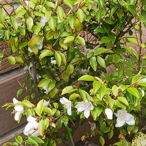 サカキ?葉っぱ にも花が咲くのですね~😆ヒメサザンカと教えて頂きました❣️ 今日の花 スノーフレイク💕