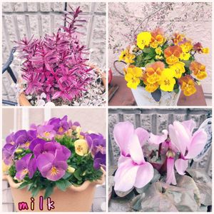 ❤ヘーベ❤···こんなに濃いピンクに変化👀✨❗ 💛ネオンミクスチャー💛···黄色から紫に変わるはずだったのに、オレンジなんだけど(°口°๑)アレッ!!? 💜パンプキン💜···これも黄色から紫に変わるビオラ💜 🩷シクラメン🩷···お花咲いたよ🎶でも美しかったシルバーリーフが傷んでます( ´•̥̥̥ω•̥̥̥`)