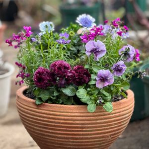 今日の庭から… 11:17〜20 昨日午後 待機苗を大鉢に寄せ植え💦 ❶ リナリア3株 ビオラ4株 プリムラマラコイデス1株 ローダンセマム・プリマリア1株 ❷ 中心のリナリア ピンク2 黄1