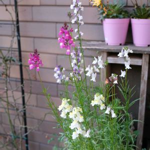 秋に山下公園でつくったたねダンゴ、もうお花が咲いています。 咲いてるのはリナリアかな?