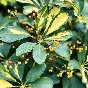 元気*素敵な葉っぱ🌿イロイロ・:*+. 🏷️8日は葉っぱの発表会 《スライドpic》 ①斑入りカポック 可愛い実🟡🔴がついてるョ♡ ②、③斑入りアオキ 実🔴🟢、お花(雄花)も咲き出しました♪ ④ミヤマシキミ 蕾が膨らんできたよ~♪ ⑤ハボタン エントランス花壇の端っこで元気に 成長😍キラキラ金粉つきです✨