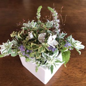 🏷️おしゃれな土曜日♪ 参加します(*ᴗˬᴗ)⁾⁾⁾ꕤ 撮影🤳2月13日 お出かけ先の生け花 1️⃣ガーベラ 素敵 おしゃれなガーベラさん 2️⃣サイネリア 白🤍とパープル💜 3️⃣レースフラワー 白🤍が上品です 4️⃣アゲラタム 💜パープルにウットリ💜 5️⃣その他に スイートピー🩷 スターチス🤍 アカシア🟡黄色いはっ葉🌿 ドラセナ🌿🤍💚
