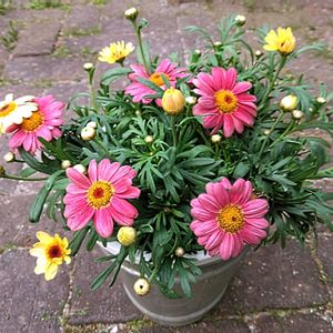 ①マーガレット アプリコットジャム🍑 ②マーガレット ソレイユ🌞 ③株分けしてもらったバーベナ💜が咲き始めました。 後ろのシクラメン🔴がずっと綺麗なのが不思議〜。 ④見えにくいけど🤣ノースポール、ポピーの寄せ植え。 ポピーの葉が最強説💦。 ⑤ハンギングのミセバヤも元気出てきたよ🙆。 だけどミセバヤってポロポロ取れるの苦手💦
