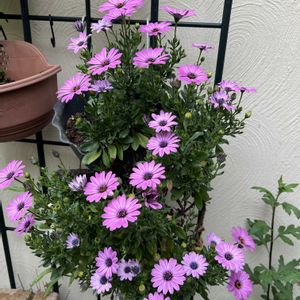 庭のかわいい鉢花🪴🪴 1️⃣ オステオスペルマム🌸🏵️ ピンク花は、木質化してきた茎を挿木した子、盛り盛りしてきました😘 2️⃣薔薇 ‥ハミングバード & 名前不明の🌹