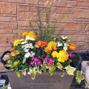 寄せ植えって難しい…🤔 マリーゴールドメインでと決めたものの合わせる苗で悩み、色で悩み…配置で悩み… 何とか完成☺️